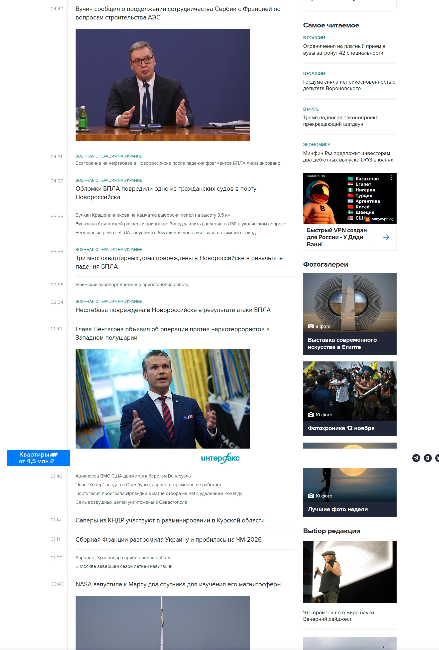Lenta.ru 是俄罗斯的一个主要新闻网站,提供广泛的新闻内容,涵盖了从国内到国际的政治、经济、社会、文化等多个领域。该网站成立于1999年,至今已成为俄罗斯最受欢迎的新闻平台之一。其内容包括最新的国内和国际新闻、深度分析、评论以及多种格式的新闻报道。作为俄罗斯的新闻源之一,Lenta.ru 提供了快速更新的新闻和多媒体内容,并且以其全面且多样化的报道风格吸引了大量的用户。